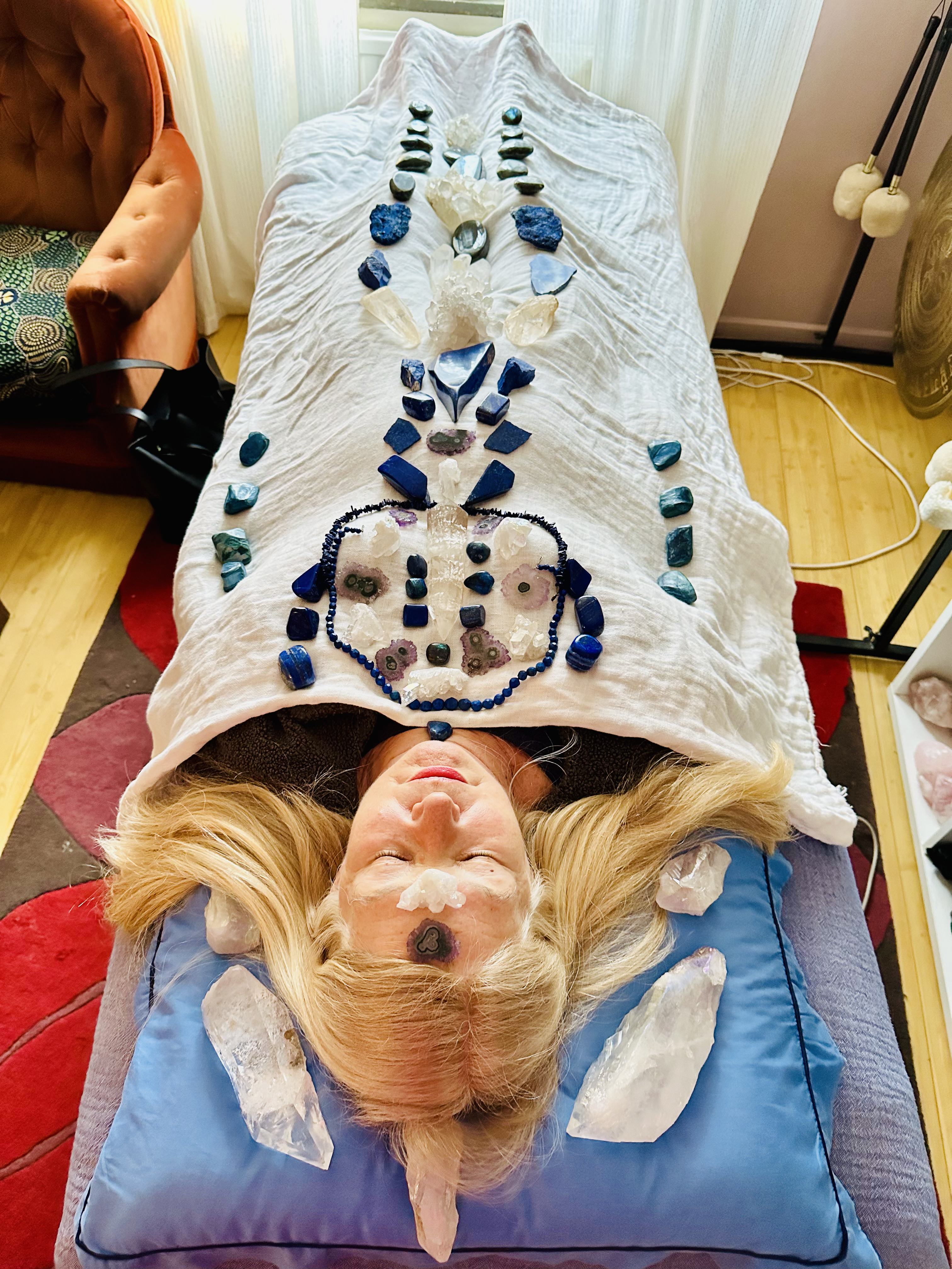 Under en kristallterapi lyssnar jag noga med mina sinnen på vad som pågår i min klients energifält. Det som brukar äga rum är känslor och tankar som skapar kaos och blockeringar i livsflödet. Jag kallar därefter på klientens själsenergi som visar vad som krävs för att klienten ska komma i balans. Därefter lägger jag stenar och kristaller i bestämda geometriska mönster som avspeglar själens energier och den helande processen sätts igång.Kristallterapin är en mycket djup och helande metod. Ibland behövs lite magi för att komma tillrätta med känslor och invanda personlighetsmönster. Att få en kristallterapi är en mycket ljuvlig upplevelse där klienten hamnar som i ett flödande ljus utan gränser och efteråt känner sig strålande och upplyft. Kristallerna arbetar mycket på den eteriska kroppen, chakrasystemet och på psyket men också på den fysiska kroppen. Den är en metod att komma mer i kontakt med själen.